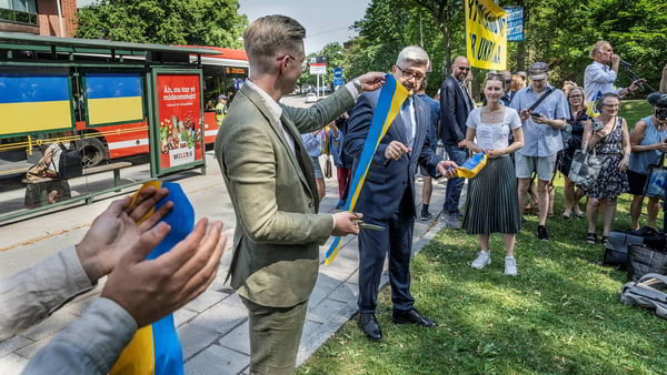 На официальной церемонии в среду советник городского правительства по вопросам дорожного движения Антон Фендерт вместе с послом Украины в Швеции Андреем Плахотнюком перерезали ленточку на автобусной остановке рядом с посольством России.