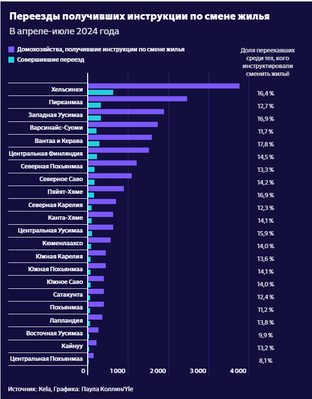 В других городах с населением более 100 000 человек переехали 13 процентов, а в остальных регионах Финляндии – 14 процентов.