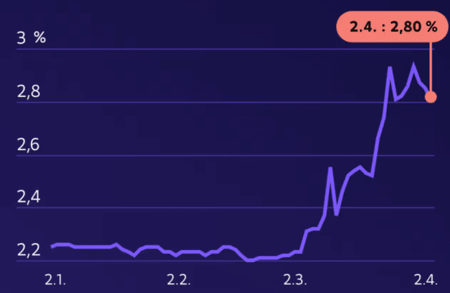 12-месячный Euribor, который обычно используется в качестве базовой ставки по ипотечным кредитам в Финляндии, в четверг 2 апреля составлял 2,80 процента.